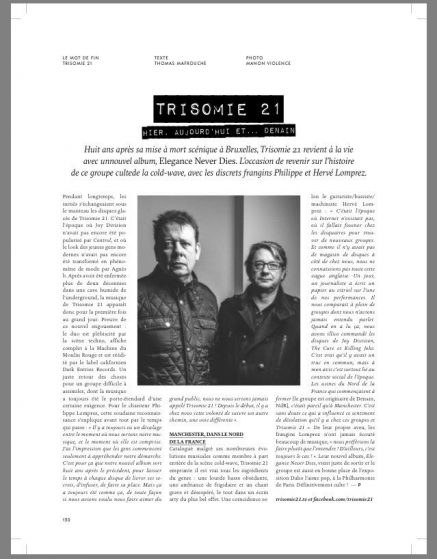 Quand je rencontre Hervé et Philippe – les deux frères Lomprez, membres fondateurs de Trisomie 21 – ils me font remarquer que quelque chose se passe en ce moment pour eux. Quoi donc? On dirait bien qu’il y a de la réhabilitation dans l’air pour le groupe : ils sont programmés dans des festivals électroniques, ont un public de plus en plus jeune aux premiers rangs et ces mêmes concerts affichent partout complet. Cerise sur le gâteau : la prestigieuse maison de disques américaine Dark Entries les a contacté pour une réédition de leurs premiers albums proto cold wave…..